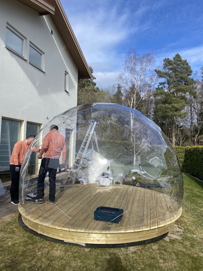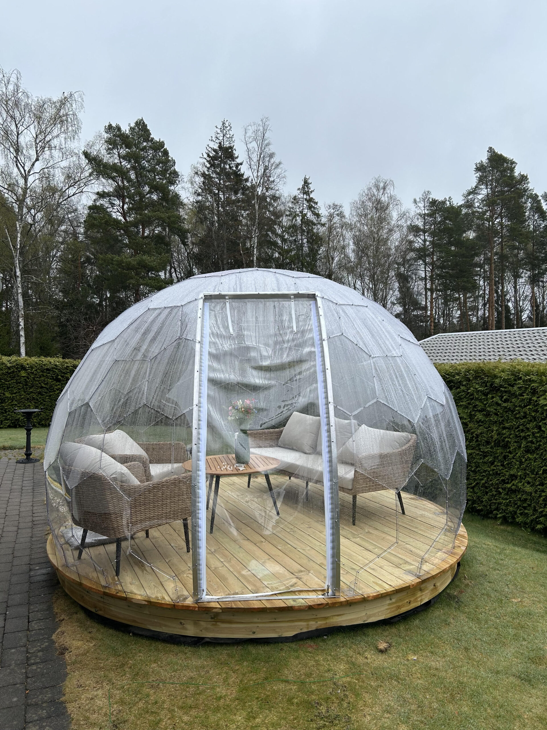 I Järfälla fick vi möjligheten att montera en Globy Dome (Medium) hos en kund som ville skapa ett unikt uterum och samtidigt ta tillvara på baksidan av trädgården, som tidigare stått oanvänd. Med sin kupolformade design blir kupolen ett naturnära uterum som smälter in i omgivningen, utan att offra utsikt eller ljusinsläpp. Den runda formen ger en känsla av rymd och öppenhet, vilket förvandlar trädgården till en naturlig förlängning av huset.
